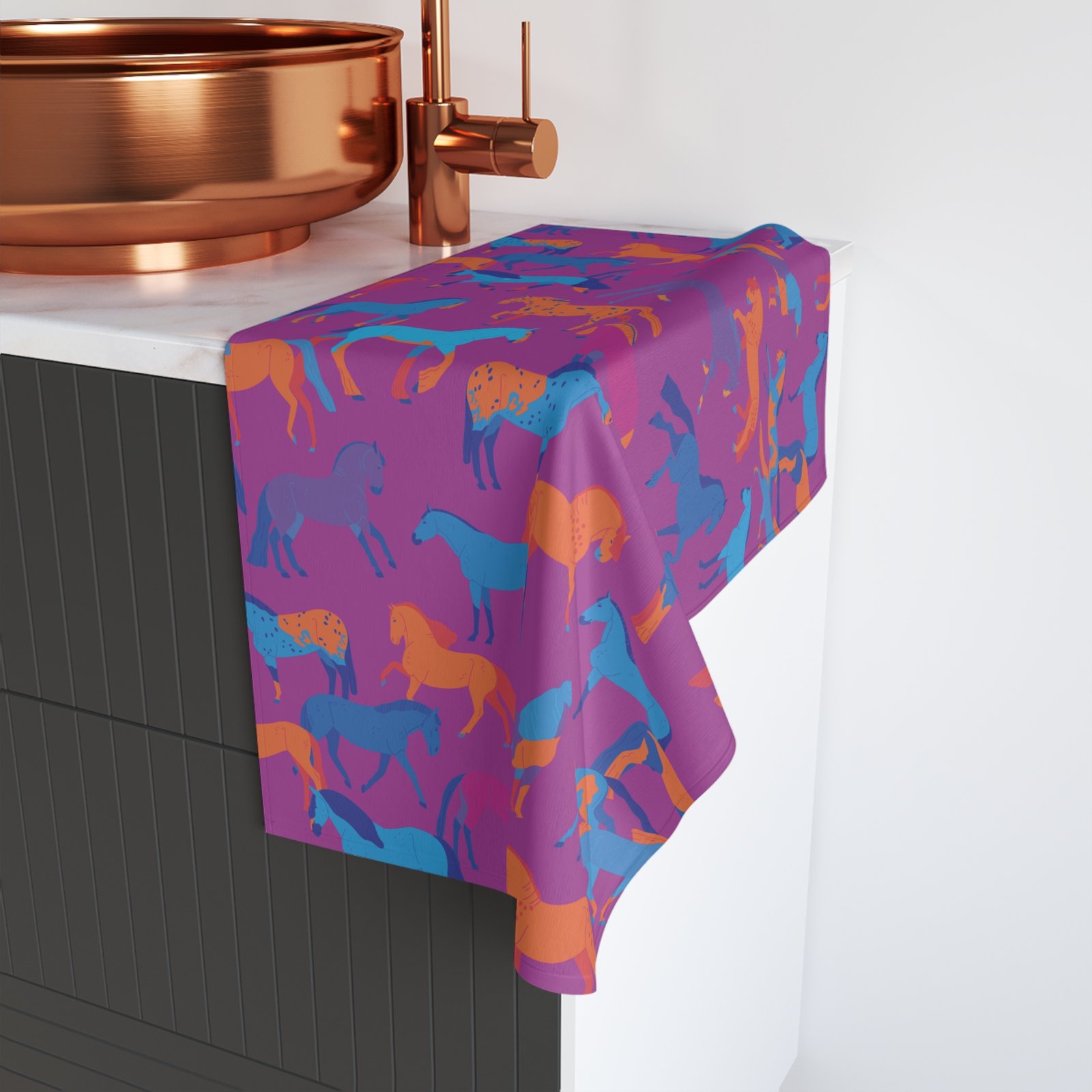 Transform your kitchen with our vibrant Horse Print Tea Towel! Featuring a playful array of horses in stunning shades of purple, orange, and blue, this towel is a delightful addition for any horse lover or anyone looking to add a pop of color to their home.
