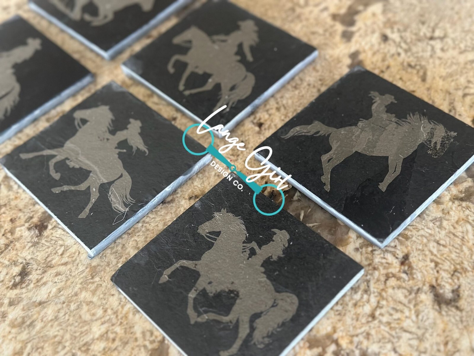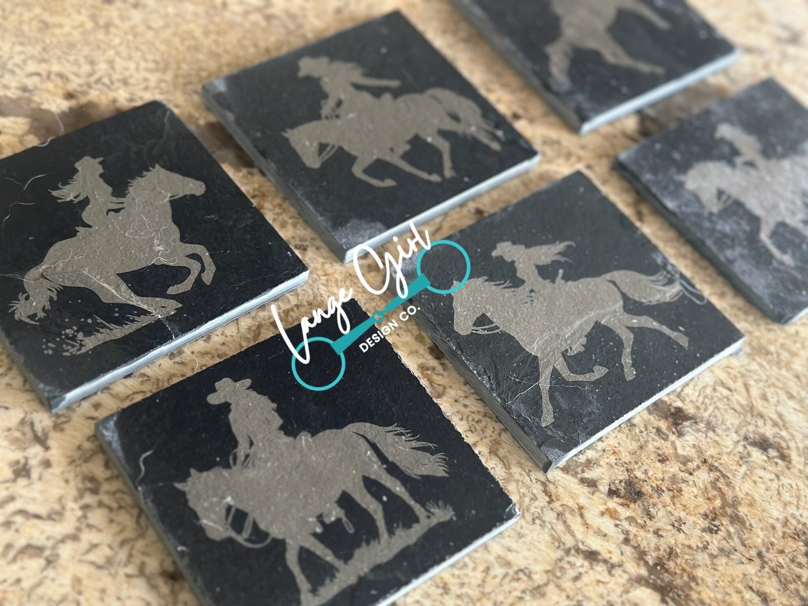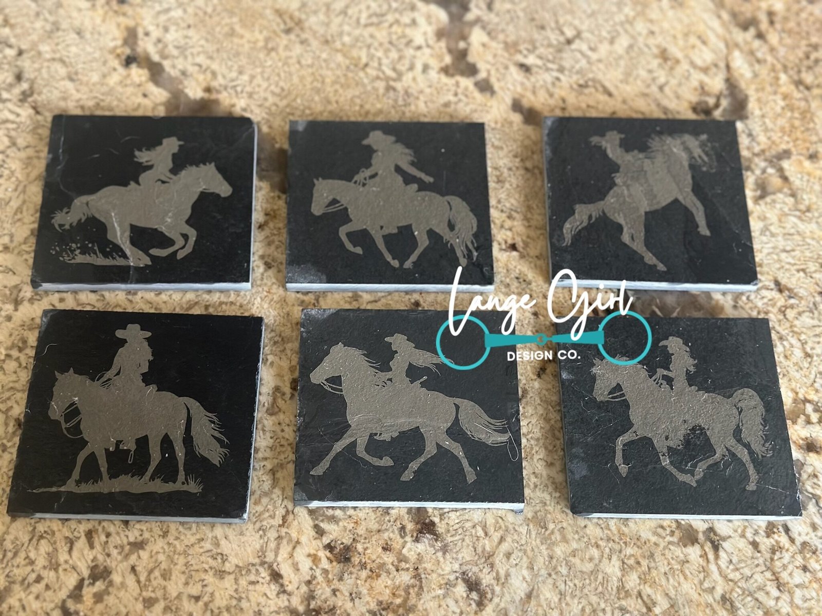 Handcrafted Cowgirl Design Slate Coaster Set (6) – Engraved Lassos, Cowboy Hats, Boots – Made in Michigan by Lange Girl Design