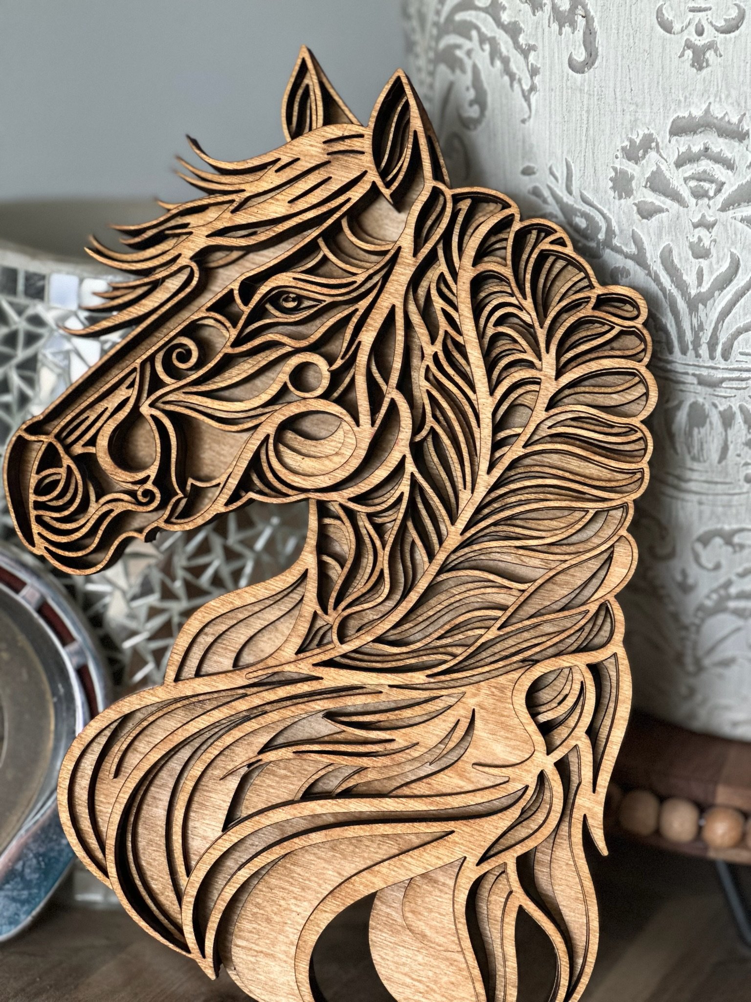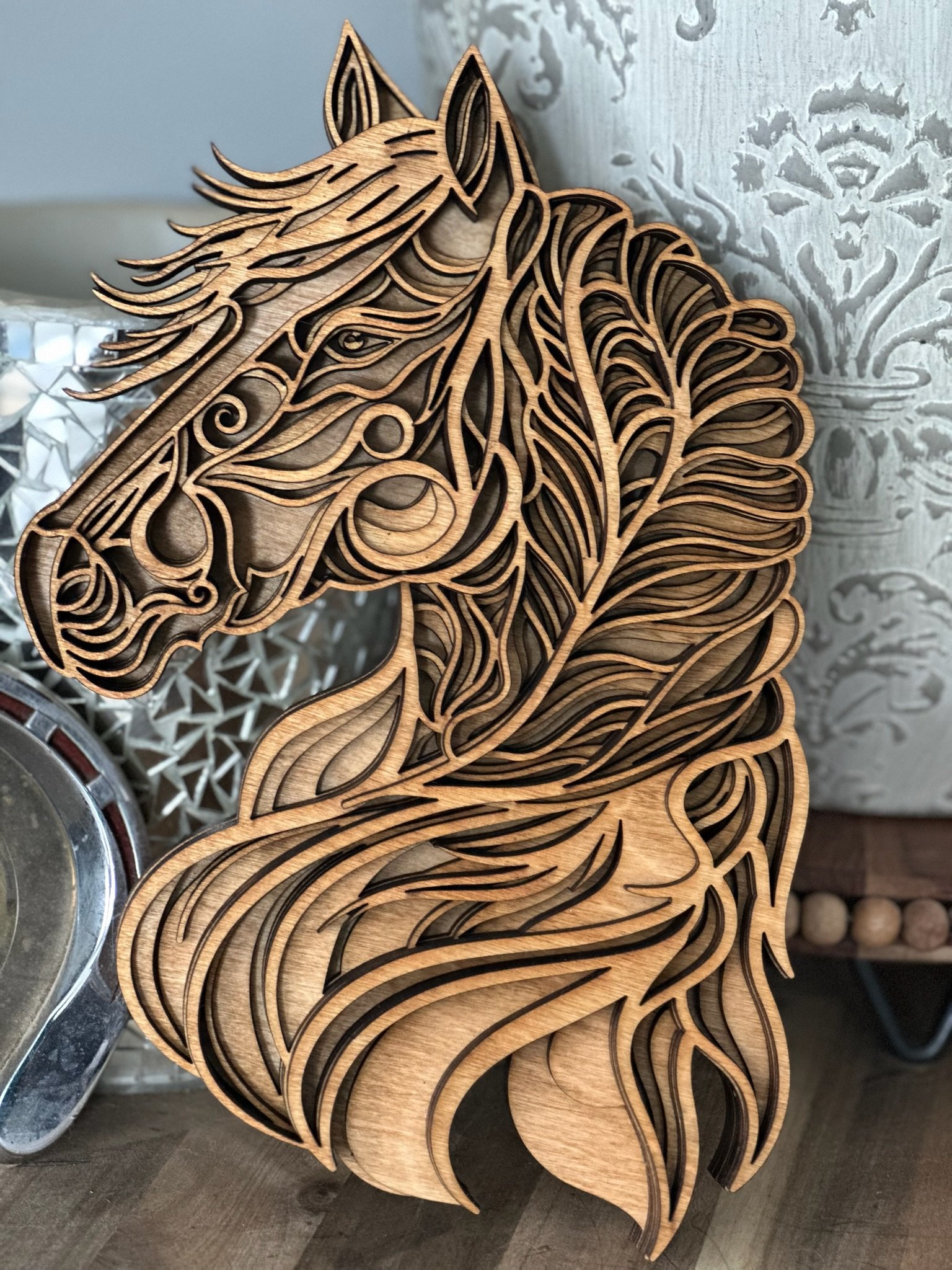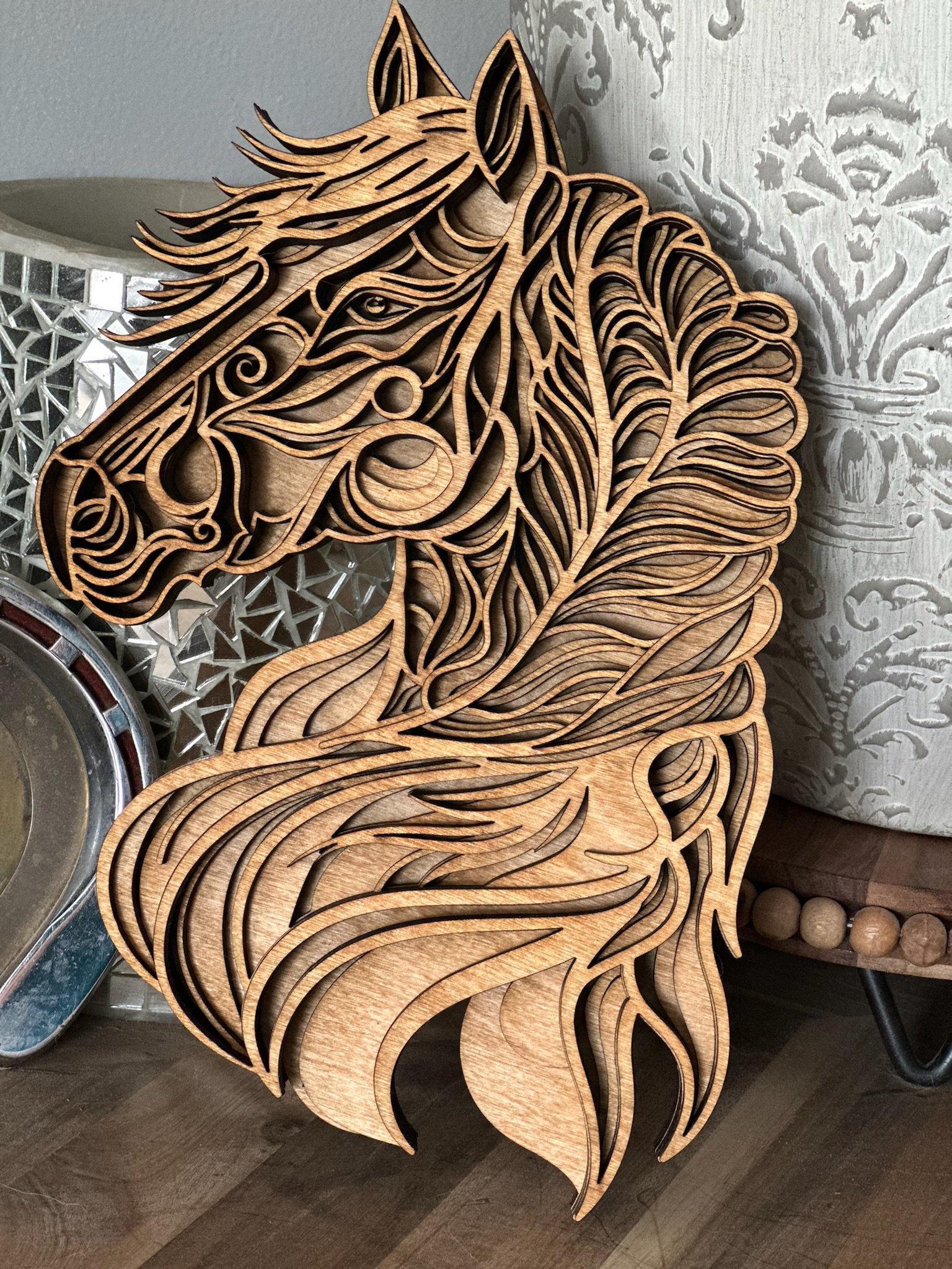 Trot into stunning decor with this handcrafted layered horse head artwork, created with love in Michigan by Lange Girl Design! I’m Lange Girl—a Colorado native who swapped the Rockies for Michigan’s countryside—and I’ve poured my equine passion into this 8.25” x 10.5” piece. Featuring 6 wood layers, it showcases a majestic horse head with intricate detailing, making it a rustic, captivating addition to your wall. Plus, this is one of many horse layered designs we make, along with a variety of other farm animal designs! • Dimensions: 8.25” x 10.5” • Layers: 6 distinct wood layers • Design: Majestic horse head with intricate wood detailing • Material: Premium layered wood • Features: Handmade, eco-friendly, rich wood finish • Care Instructions: Wipe gently with a dry cloth; avoid moisture Perfect for horse lovers, farm decor enthusiasts, or anyone seeking a unique gift, this artwork brings equine elegance indoors! Ideal for holidays, birthdays, or housewarmings, straight from my Michigan farm studio. Customize your own horse or farm animal design—contact us for options! Product Options • Quantity: 1 Piece • Customization: Select from various horse or farm animal designs (contact for options) Key Features • Handcrafted by Lange Girl Design, a native Coloradan turned Michigander • 8.25” x 10.5” artwork with 6 layered wood horse head • Premium wood, eco-friendly and rustic • One of many horse designs and other farm animal options • Perfect gift for equestrian and farm animal fans and home decor lovers