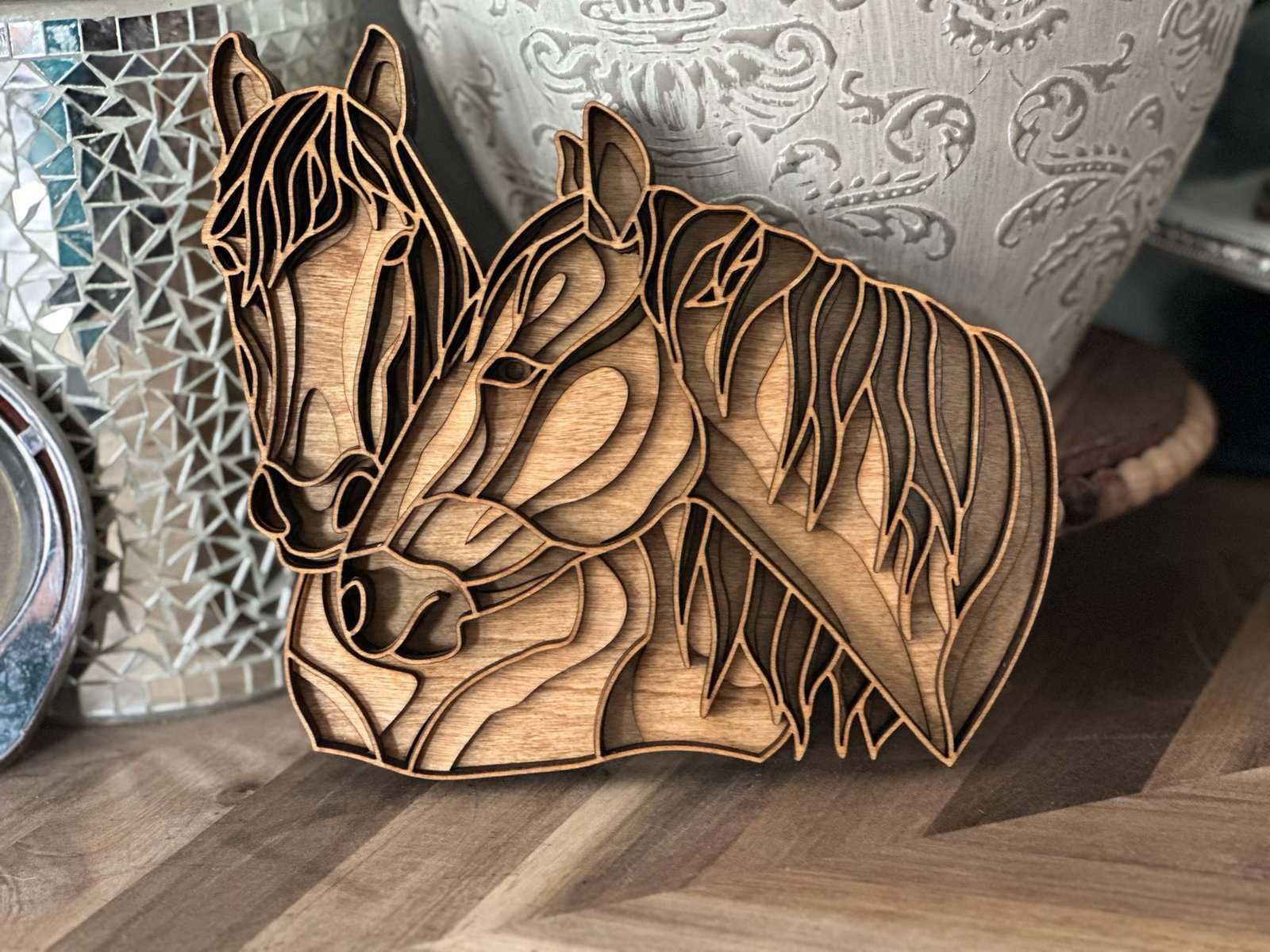 Gallop into heartwarming decor with this handcrafted layered horse nuzzling artwork, created with love in Michigan by Lange Girl Design! I’m Lange Girl—a Colorado native who swapped the Rockies for Michigan’s countryside—and I’ve poured my equine passion into this roughly 9” x 8” piece. Featuring 6 wood layers, it captures the tender moment of horses nuzzling, making it a rustic, soulful addition to your wall. Plus, this is one of many horse layered designs we make, along with a variety of other farm animal designs! • Dimensions: Approx. 9” x 8” (slight natural variations) • Layers: 6 distinct wood layers • Design: Horses nuzzling with intricate wood detailing • Material: Premium layered wood • Features: Handmade, eco-friendly, rich wood finish • Care Instructions: Wipe gently with a dry cloth; avoid moisture Perfect for horse lovers, farm decor enthusiasts, or anyone seeking a unique gift, this artwork brings equine charm indoors! Ideal for holidays, birthdays, or housewarmings, straight from my Michigan farm studio. Customize your own horse or farm animal design—contact us for options! Product Options • Quantity: 1 Piece • Customization: Select from various horse or farm animal designs (contact for options) Key Features • Handcrafted by Lange Girl Design, a native Coloradan turned Michigander • Approx. 9” x 8” artwork with 6 layered wood horses nuzzling • Premium wood, eco-friendly and rustic • One of many horse designs and other farm animal options • Perfect gift for equestrian and farm animal fans and home decor lovers