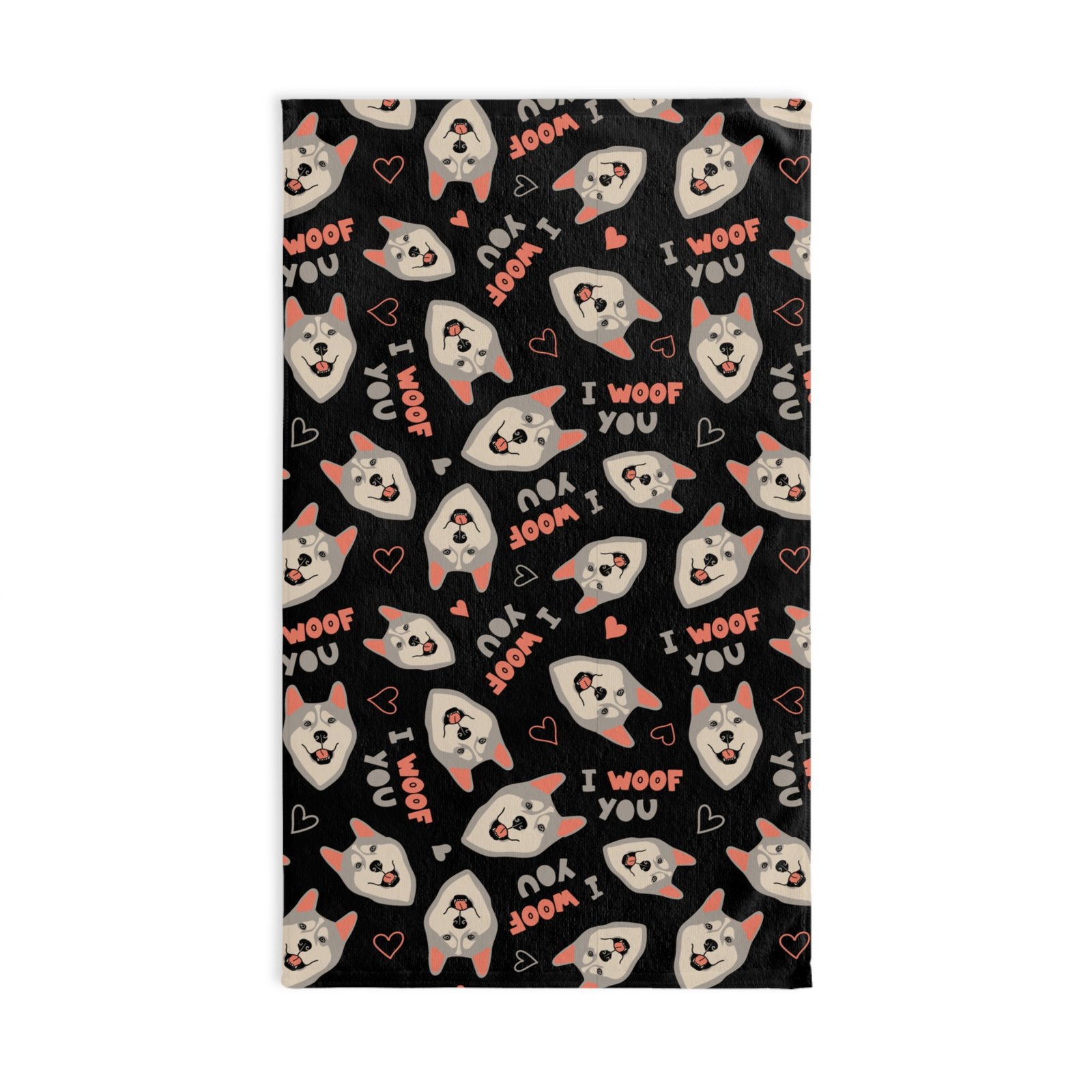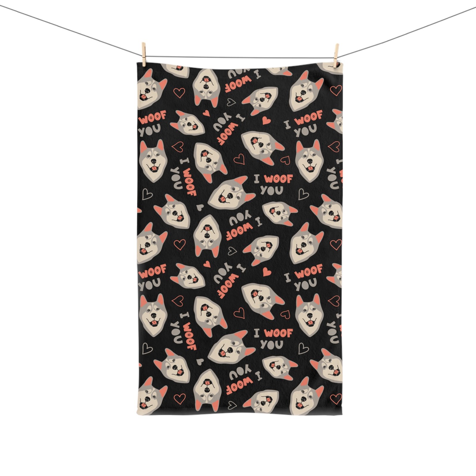 Add a splash of personality to your kitchen with our charming Siberian Husky tea towel, featuring an adorable grey husky design! This delightful towel showcases playful husky faces along with endearing phrases like “I Woof You,” making it a must-have for any dog lover.