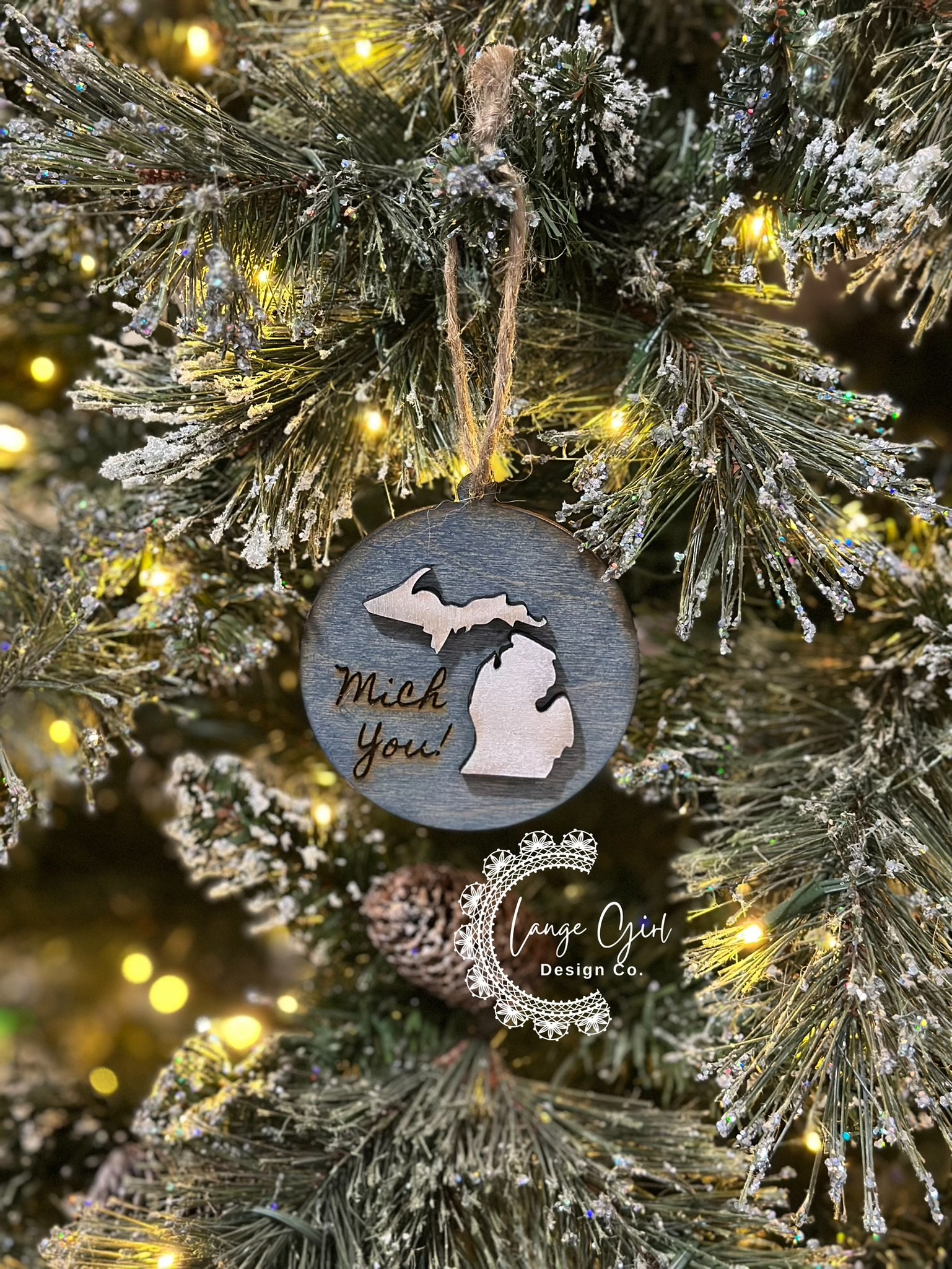 Because sometimes “I miss you” just doesn’t cut it… say it the Michigan way with our Mich You! ornament** from Lange Girl Designs in Tecumseh, Michigan. This sweet little piece features: • A natural wood Michigan silhouette (Upper & Lower Peninsula) raised on a rustic round • Hand-painted weathered blue-gray background with wood-grain showing through • “Mich You!” engraved in playful script across the front • Ready to hang with natural jute twine Size: 3.5 inches round Finish: light protective seal – built to last season after season Perfect for: • Michigan expats who moved away • College kids at State or U of M • Military families stationed out of state • Care packages • Anyone who bleeds maize & blue (or just loves the lakes)