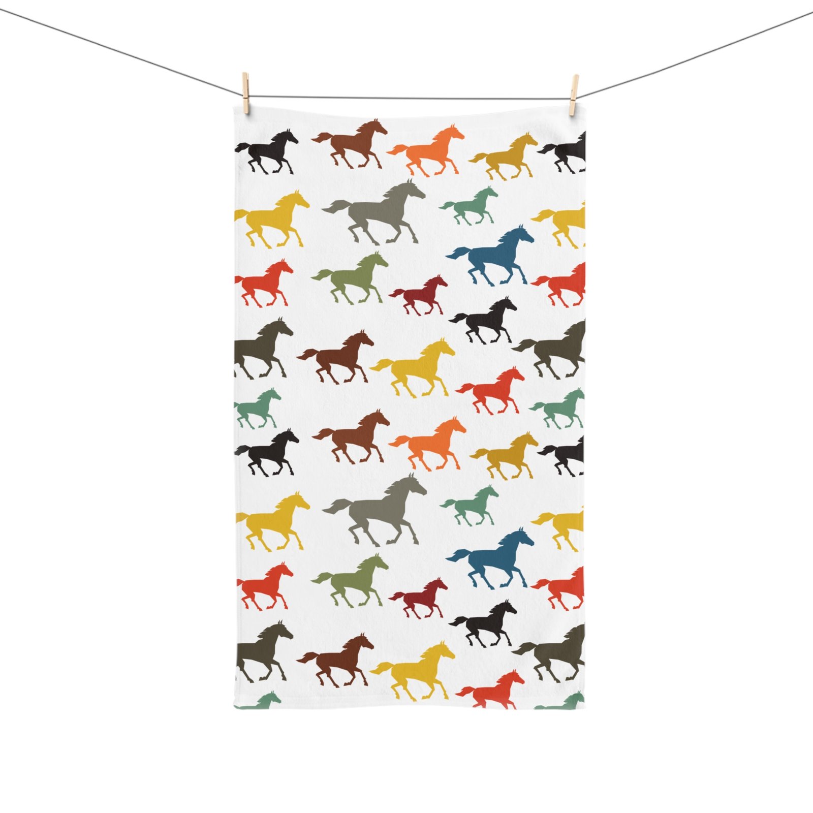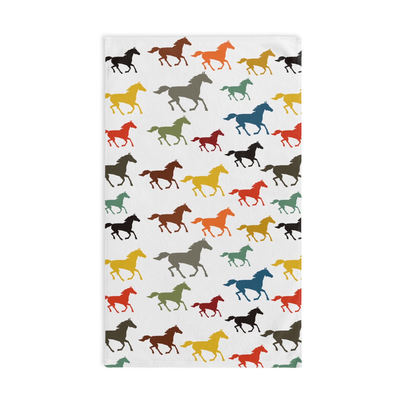 Brighten up your kitchen with our lively Horse Print Tea Towel! This whimsical design features an array of colorful horses in vibrant shades of red, yellow, green, and blue against a crisp white background, making it a cheerful addition to any home.