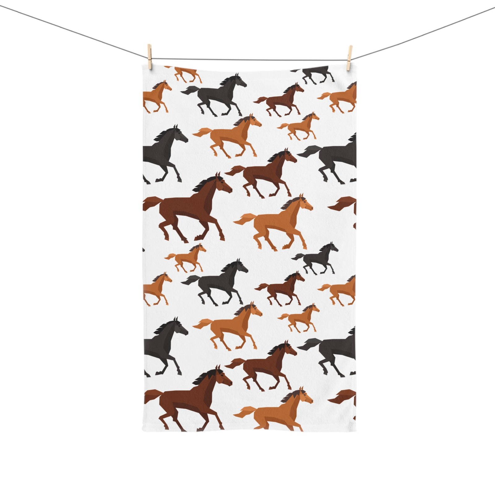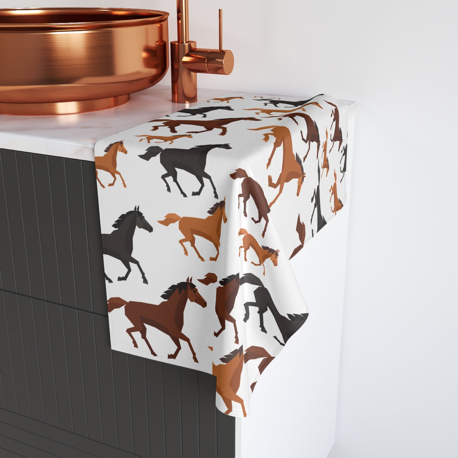 Enhance your kitchen with our elegant Horse Print Tea Towel, designed for both functionality and style. Featuring a beautiful assortment of galloping horses in warm tones of brown, black, and cream, this towel adds a rustic charm to any space.