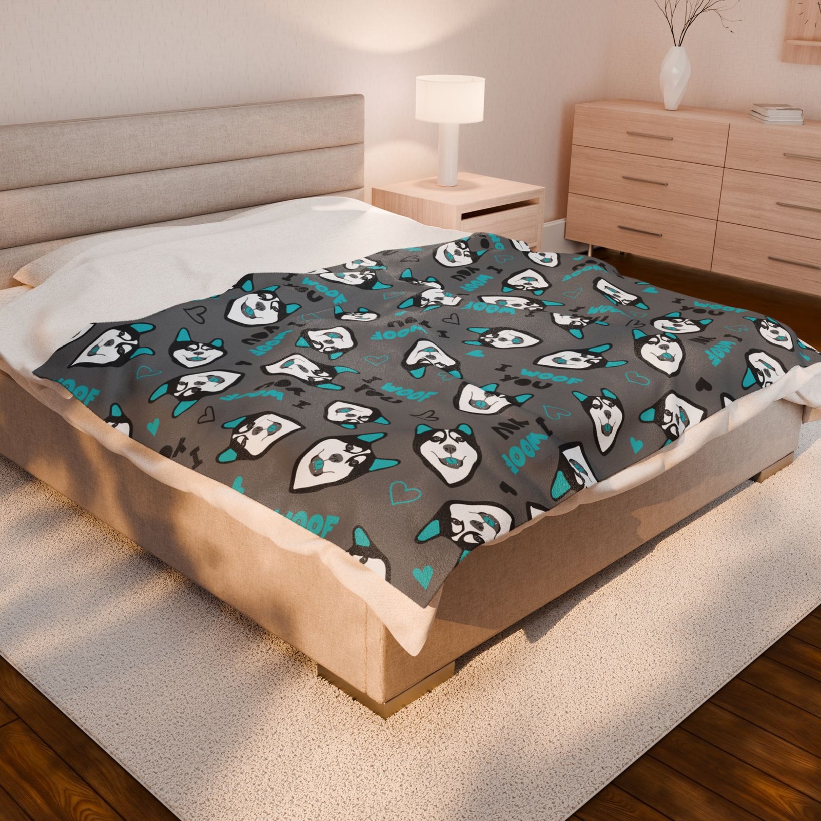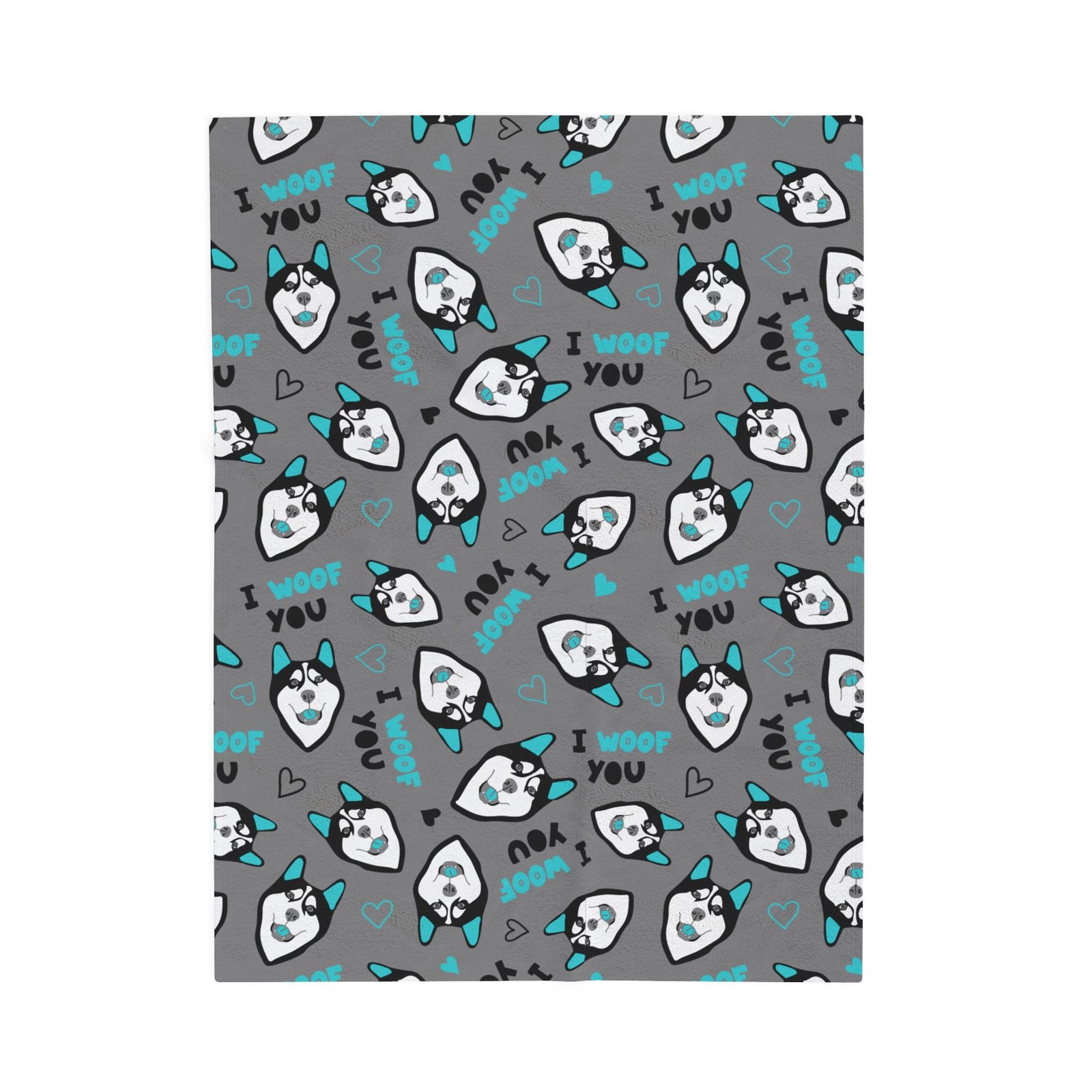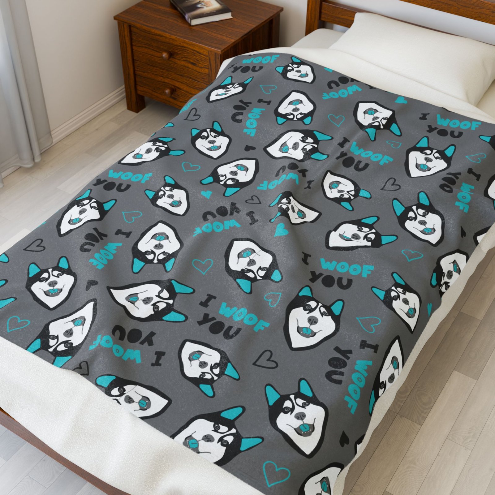 Siberian Husky Dog I Woof You Grey & Aqua Velveteen Plush Blanket