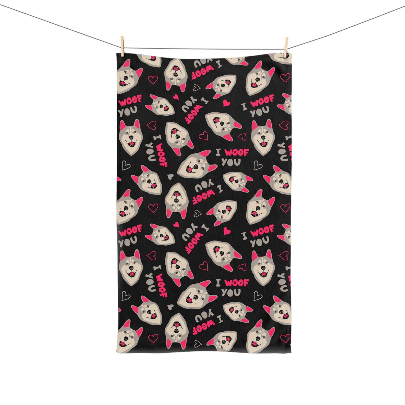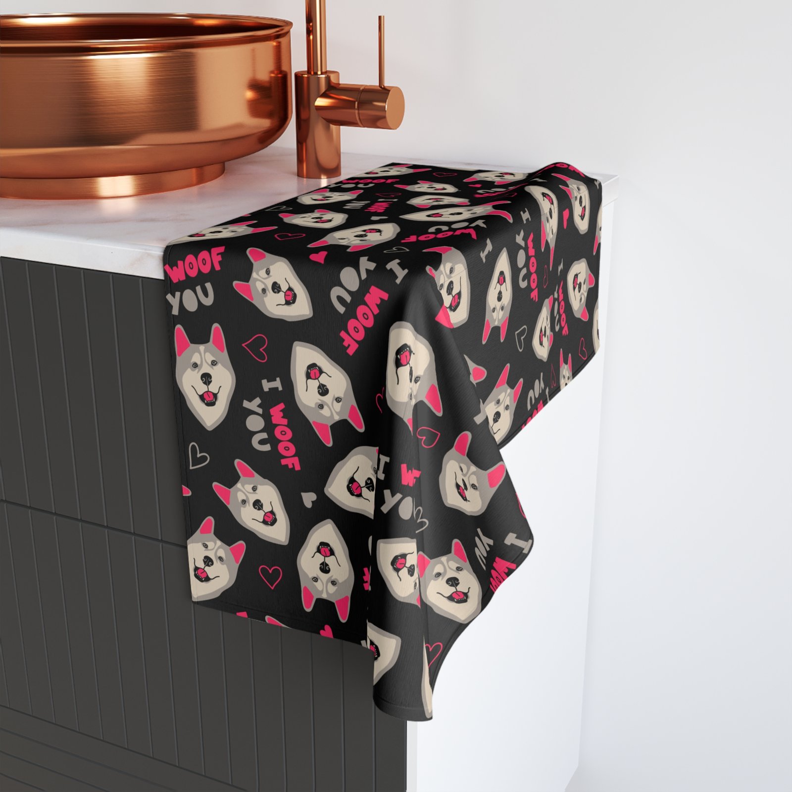 Brighten your kitchen with our adorable Siberian Husky tea towel, featuring a charming grey husky design! This delightful towel showcases playful husky faces paired with vibrant pink accents and cheerful phrases like “I Woof You,” making it a perfect accessory for dog lovers.