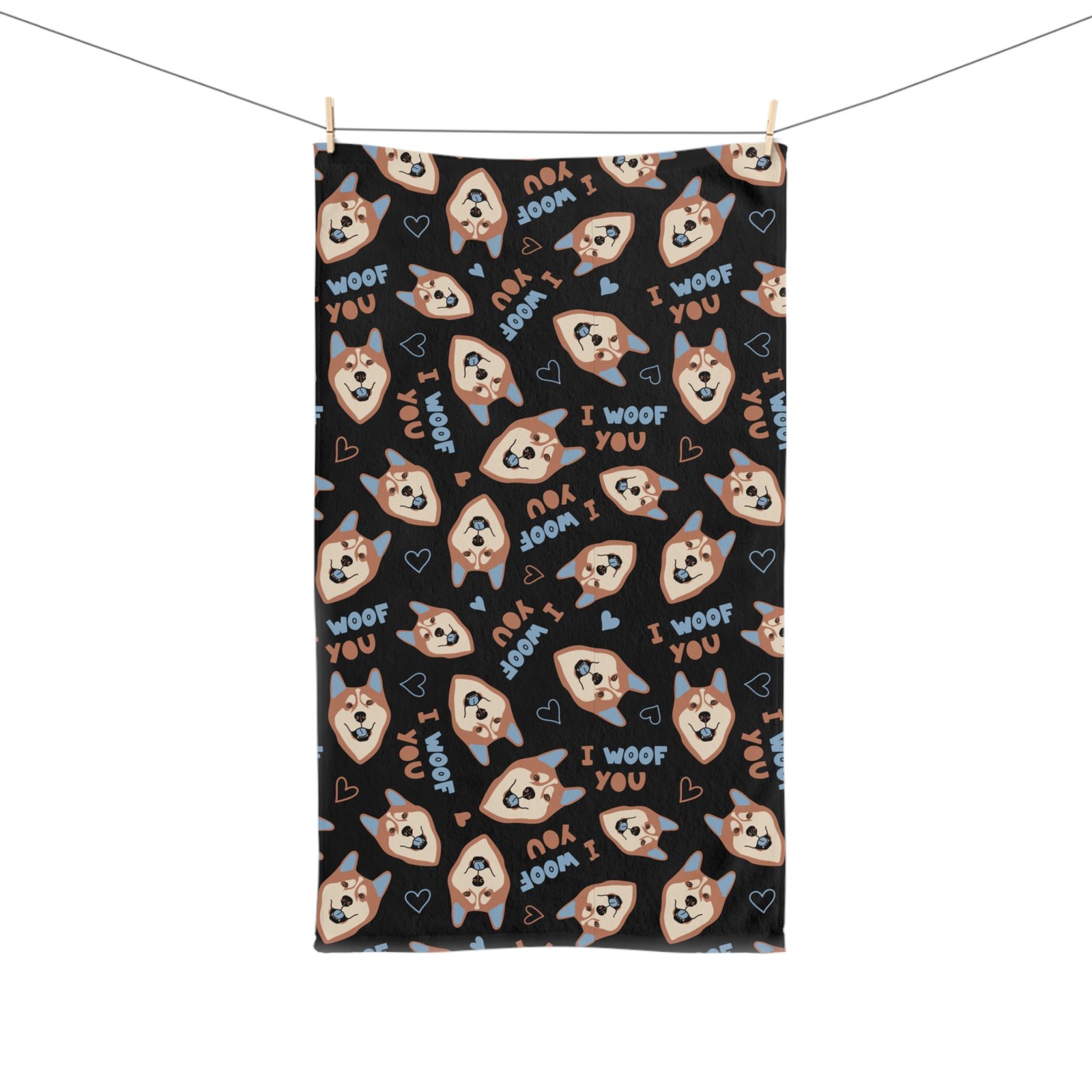 Brighten your kitchen with our delightful Siberian Husky tea towel, featuring an adorable red husky design! This fun towel showcases playful husky faces paired with cheerful messages like “I Woof You,” making it the perfect accessory for dog lovers.